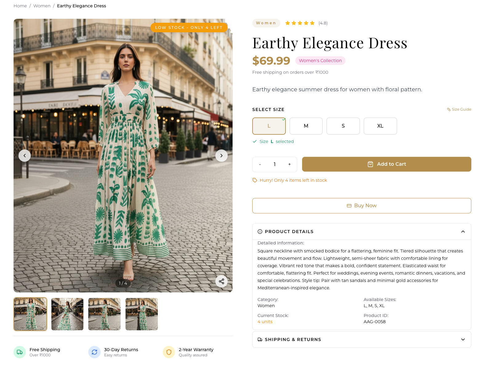 Immersive product pages highlighting fabric textures, premium craftsmanship, and sizing guides.